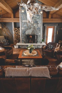 Mandi führt Great Bear zusammen mit ihren Töchtern Dyllan und Zoe. Ein gewisser femininer Touch ist in der Lodge in vielen liebevollen Details sichtbar. Besonders beeindruckend ist die gemütliche Ausstattung der Blockhaus-Lodge am Waldrand, der Saunahütte mit Tauchbecken am Bach und der wohnlichen Gästehütten. Wo sonst oft die in Nordamerika üblichen Fertigbadzellen aus Kunststoff mit Plastik-Duschvorhängen verbaut werden, wurden bei Great Bear in den Bädern schöne Fließen mit Regenduschen und Glasdusch-Abtrennungen verbaut. Jede Gästehütte, die als Einzel- oder Doppelzimmer fungieren kann, hat vor dem großen Panoramafenster mit Blick auf den Fluss zwei gemütliche Sessel neben einem Kaminofen. In den Hütten und der Lodge wurden zahlreiche Lampen und Accessoires aus dem Treibholz des Flusses geschaffenen – viele sind wahre Meisterwerke, alle Unikate. Den großen offenen Kamin in der Lodge hat Mandis Tochter Dyllan selbst gebaut.