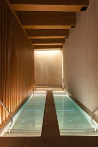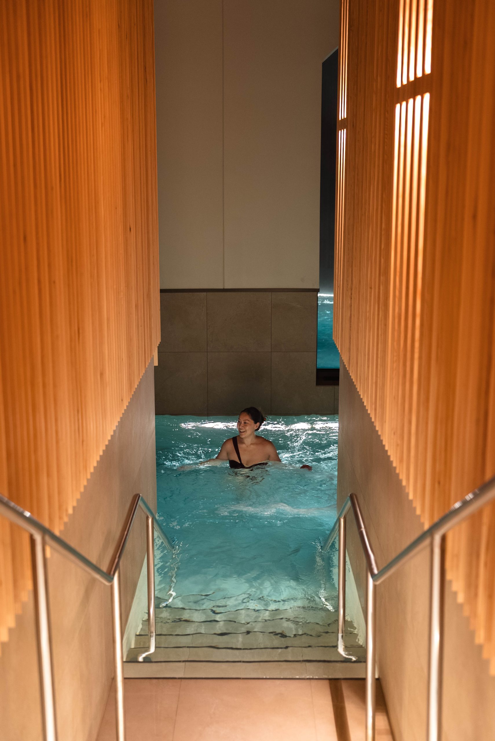 Zum Start drehe ich eine Runde im Gletscherwasser-Pool: Der Dampf des warmen Wassers steigt in die frostklare Luft während ich meine Bahnen ziehe. Allzulange halte ich es trotz des warmen Wassers nicht in dem Außenpool aus. Dafür ist es heute mit Minus 20 Grad zu kalt. Durch die automatische Tür schwimme ich in den Innnenbereich des Pools und setze meine Spa-Experience mit klassischem Kneipschen Wassertreten fort. Das abwechselnd eiskalte und lauwarme Wasser regt die Durchblutung in meinen vom Skifahren angestrengten Beinen wunderbar an.